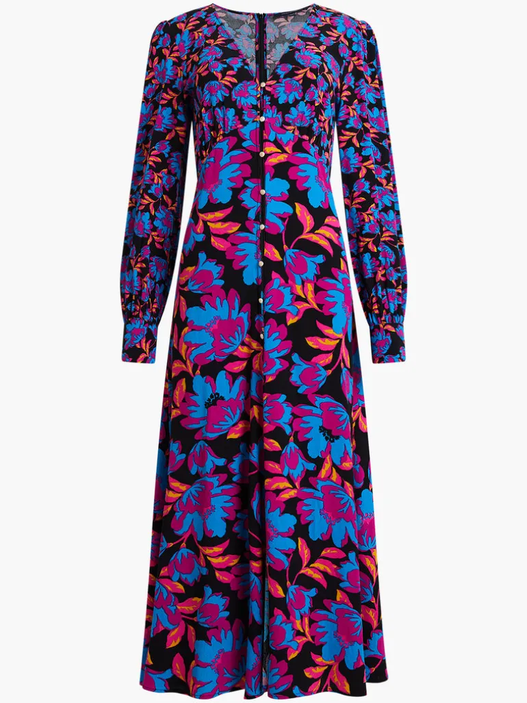 Brighten up your staple style this season with the help of our Darla Eco Anita Drape Midi Dress. Vividly vibrant flowers flourish across this flattering midi dress, framed by long sleeves and flaunting a flirty v-neckline which leads to contrasting buttons.We have chosen to use a viscose yarn from LENZING™ called ECOVERO™ . The sustainable viscose fibres are produced using wood pulp, derived from responsibly managed forests.DressFabric: eco blend, floral print, black + multi-colouredLong sleeves with buttoned cuffsV-necklineContrasting button-down front detailingBack zip fasteningRegular fitMidi lengthSize 10 length is 129cmOur model is 5ft10″ and wearing a UK Size 8Style code – 71VDQ