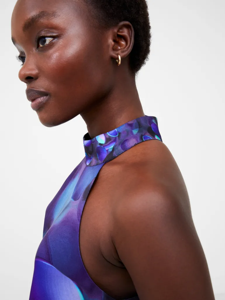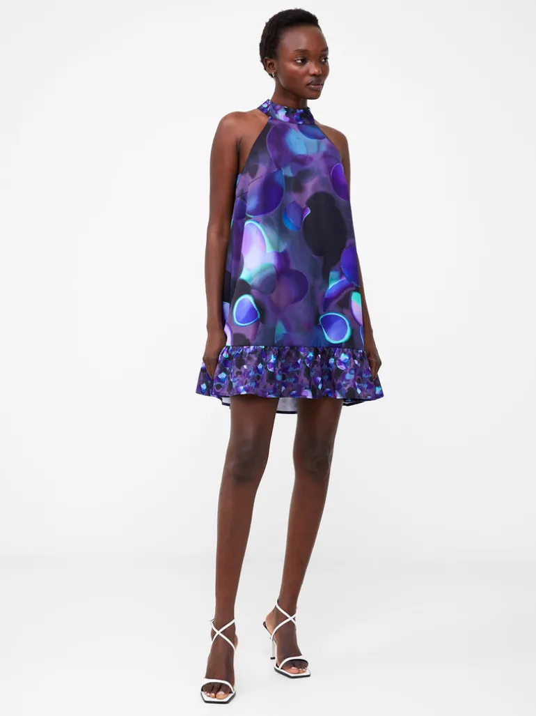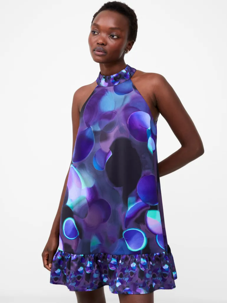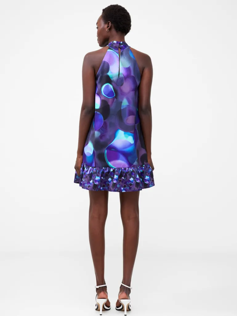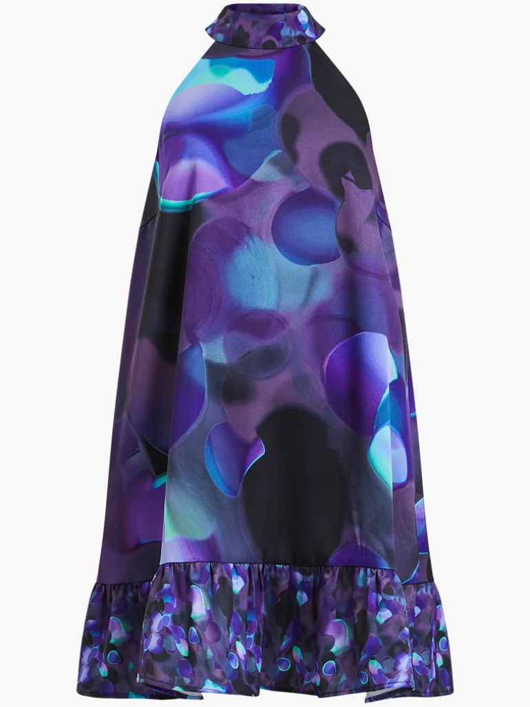 Transform your going-out wardrobe with the abstract allure of our Eva Harlow Recycled Satin Swing Mini Dress. This sweet and enchanting mini dress is hosted by a playful halterneck with back keyhole button fastening, whilst falling to a lively frill hem. Its captivating and colourful abstract print is showcased in a smooth satin sheen, ready to stand out during party dress season. Don’t forget to dress up with glitz jewellery to complete the full look.The fabric used in this product is made from recycled Polyester. Recycled Polyester is made from post consumer products.Swing dressFabric: recycled, satin, abstract print, purple + blueSleevelessHalterneck with back button fasteningBack keyhole cut-outTiered frill hemMini lengthSize 10 length is 85cmOur model is 5ft10″ and wearing a UK Size 8Style code – 71VON