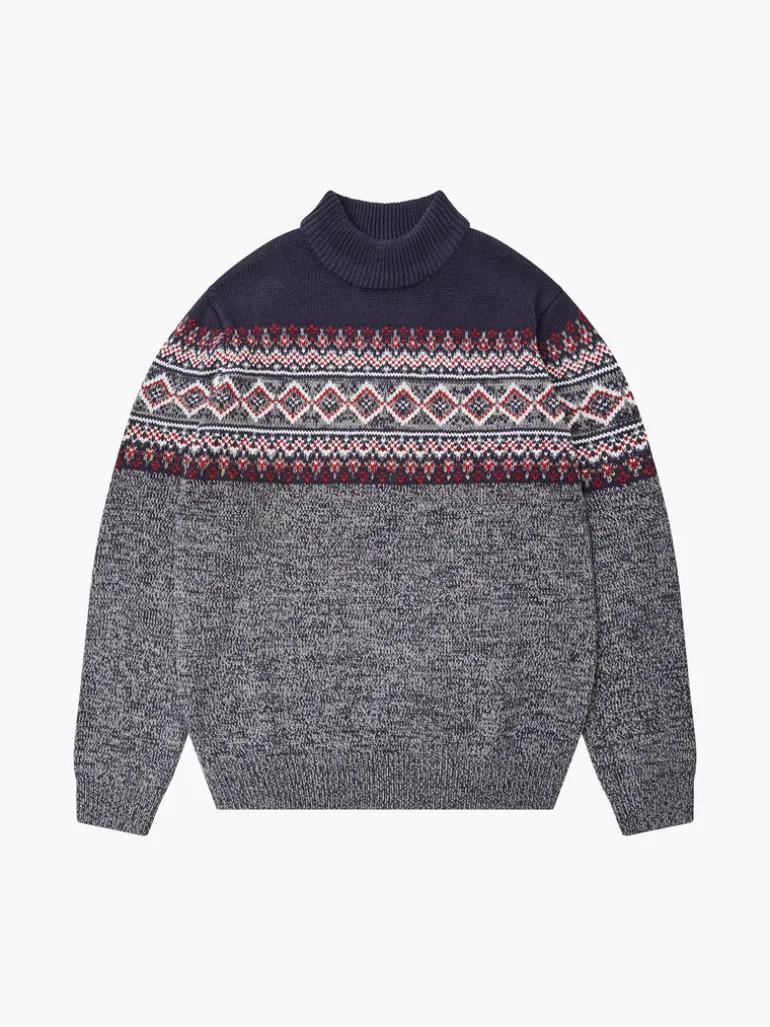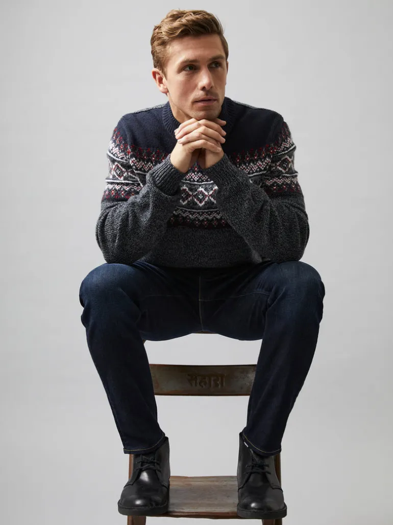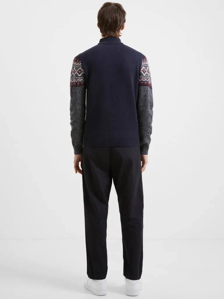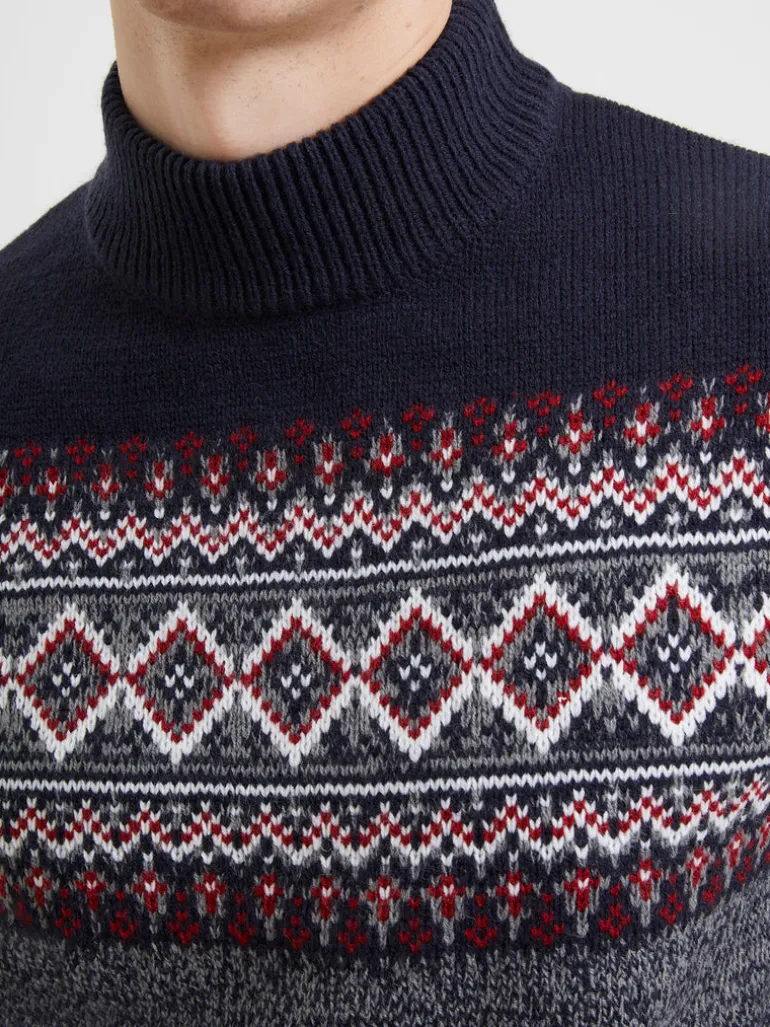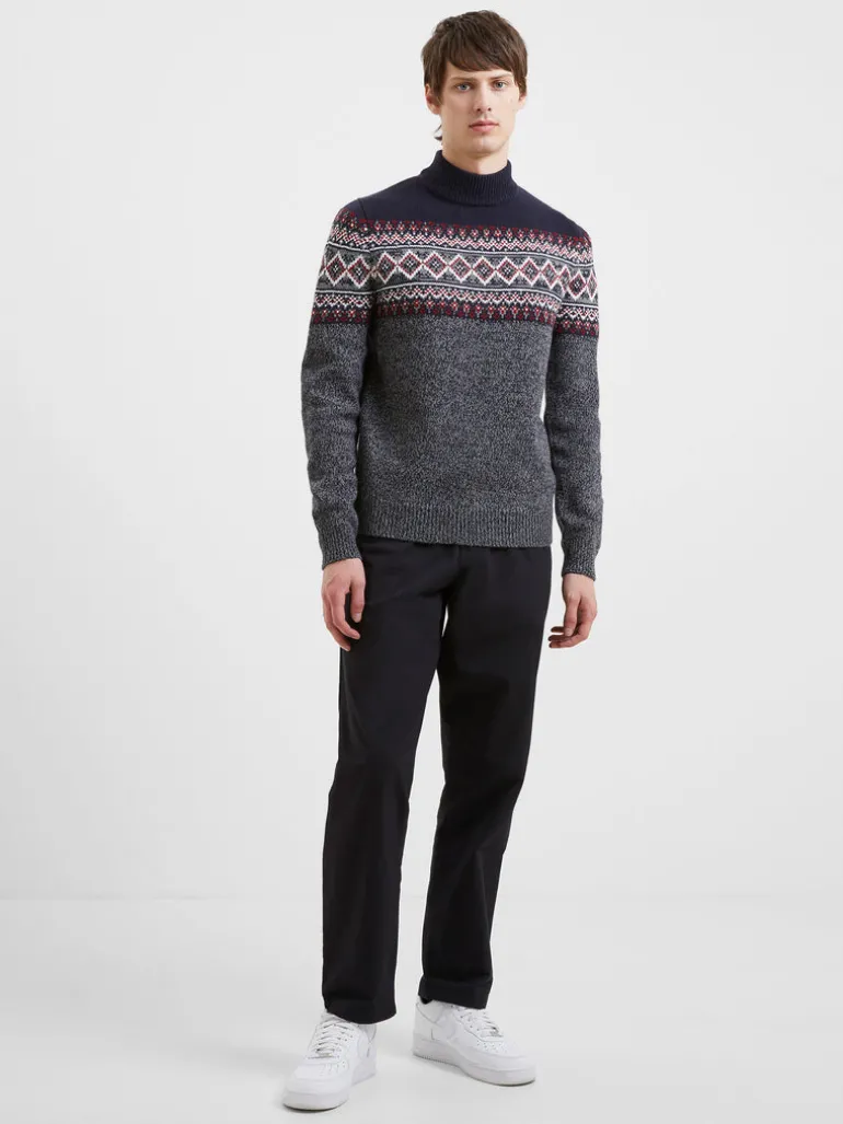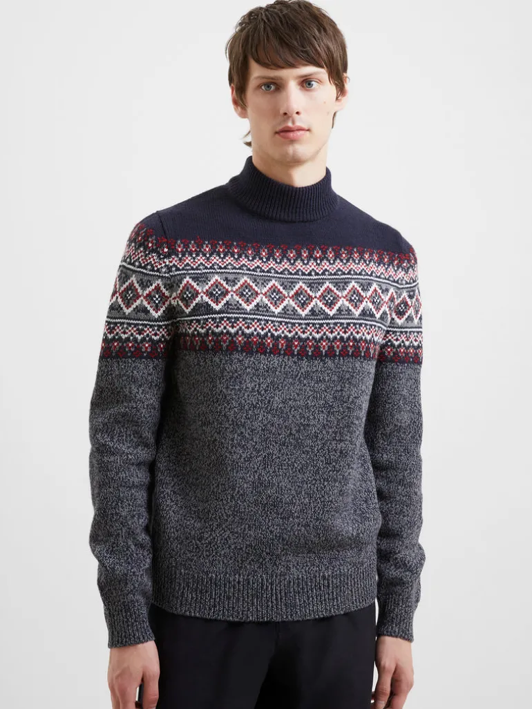 Your knitwear collection is need of a geo update. Our Fairisle Jumper offers a cosy, classic style for the season, framed by long sleeves and a comfortable high neckline and boasting a body brought to life with a fairisle knit design.JumperFabric: soft knit, fairisle pattern, dark blue + greyLong sleevesHigh necklineRibbed hemRegular fitStyle code – 58VEA