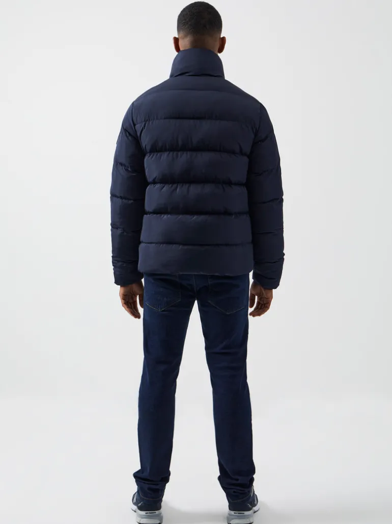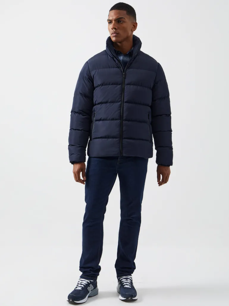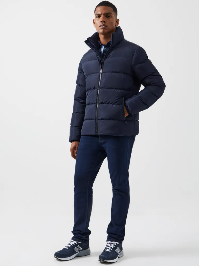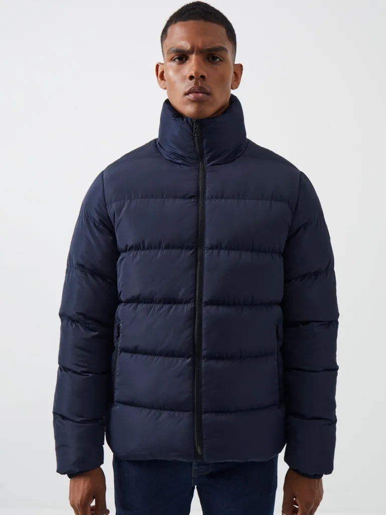 A cold breeze is no match for our Funnel Neck Row Puffer Jacket. This mid-weight jacket is a new take on an old favourite, with a funnel neck to cover you from cold winds, zipped pockets and puffer style set out in horizontal rows.Puffer jacketFabric: polyester, water-resistant, mid-weightLong sleevesFunnel neckFront zip fasteningZipped pocketsStyle code – 55TEC