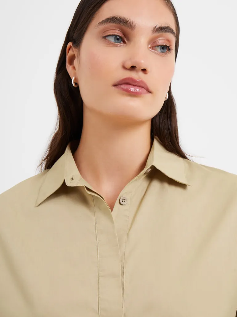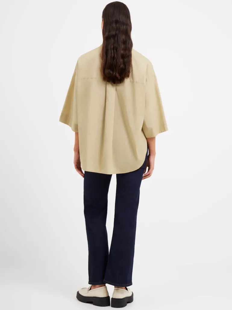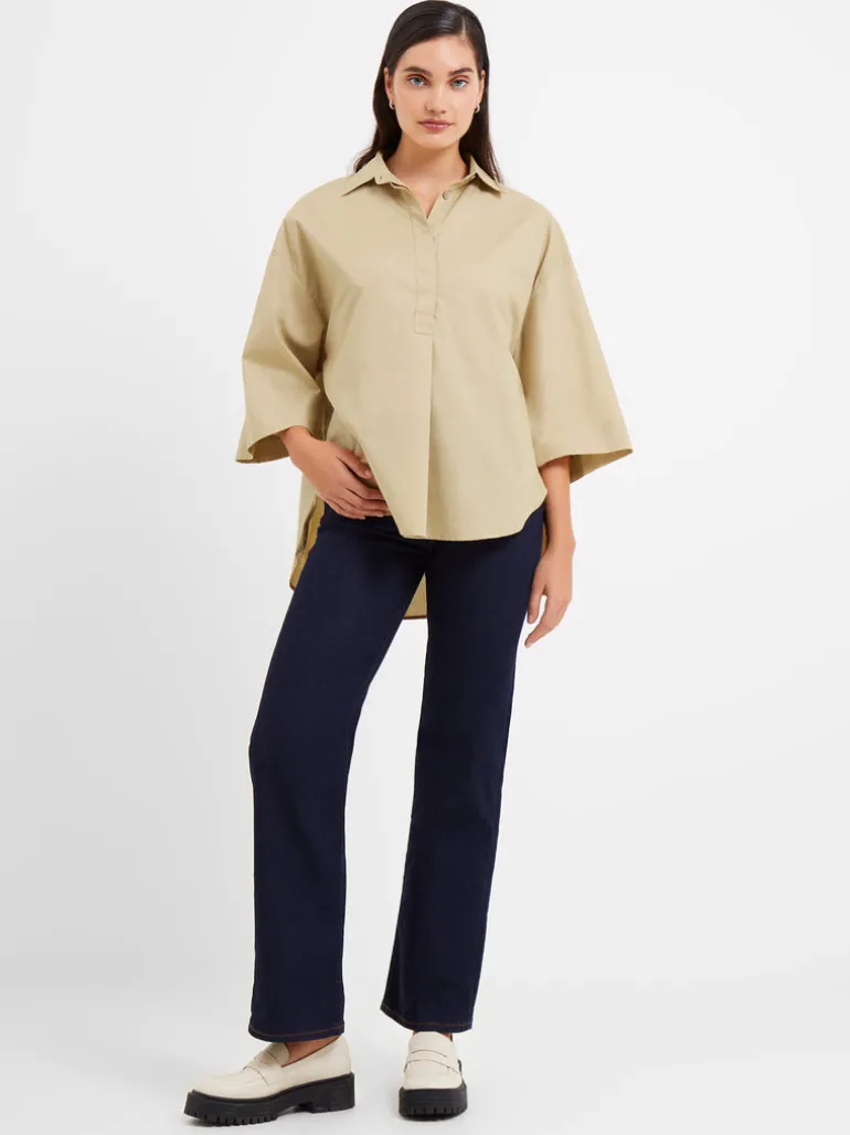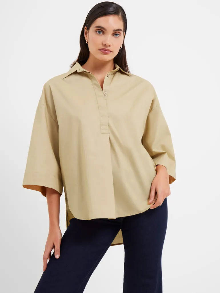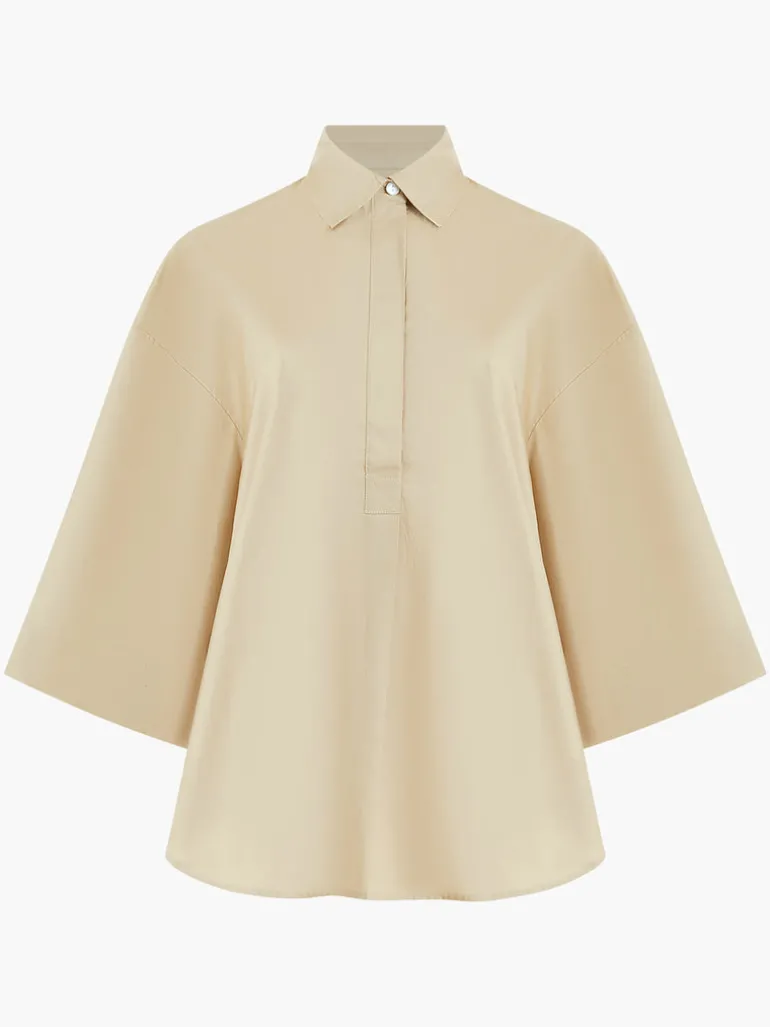 We’ve found the next great addition to your wardrobe. Our Rhodes Poplin Popover Shirt takes a classic and casual popover shirt silhouette and creates it effortlessly with fluted sleeves and a concealed buttoned placket, making this piece ideal for both workdays and weekends.Please note: our popover shirts are an oversized fit, if a more fitted style is preferred then we recommend sizing down.Popover shirtFabric: ligthweight, poplin, beige3/4 length fluted sleevesCollarConcealed buttoned placketHi-low dip hemStyle code – 72MZE