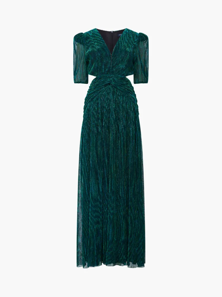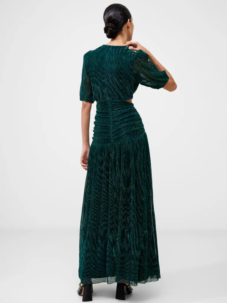 Our Sparkle Cut Out Maxi Dress is a sparkling example of occasionwear for the season. An old-school glamour meets contemporary full length silhouette, framed by a flirty v-neckline and shapely puff sleeves, boasts a flattering waist with cut out sides and ruched panel, all presented in a glistening finish. Sophistication looks best in sparkles.DressFabric: ribbed, sparkle finish, dark green3/4 length puff sleevesV-necklineSymmetric waist cut-outsRuched waistBack zip fasteningLinedMaxi lengthSize 10 length is 144cmOur model is 5ft10″ and wearing a UK Size 8Style code – 71VPU